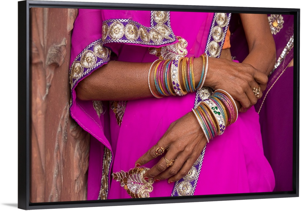 <p>Jewelry on womans arms by the Taj Mahal in India.</p>
