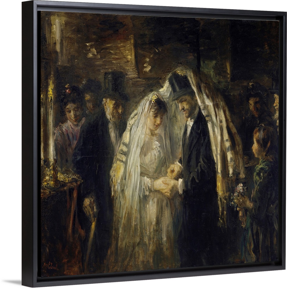 <p>Jewish Wedding, by Jozef Israels, 1903, Dutch painting, oil on canvas. The bride and groom are under the prayer shawl, as he places the ring on her finger. A small group of guests stand around the couple.</p>