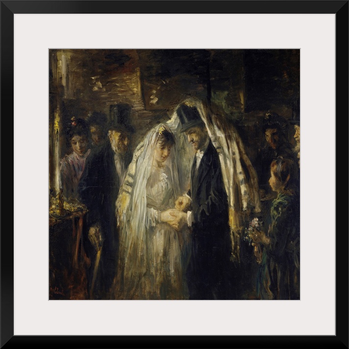 <p>Jewish Wedding, by Jozef Israels, 1903, Dutch painting, oil on canvas. The bride and groom are under the prayer shawl, as he places the ring on her finger. A small group of guests stand around the couple.</p>