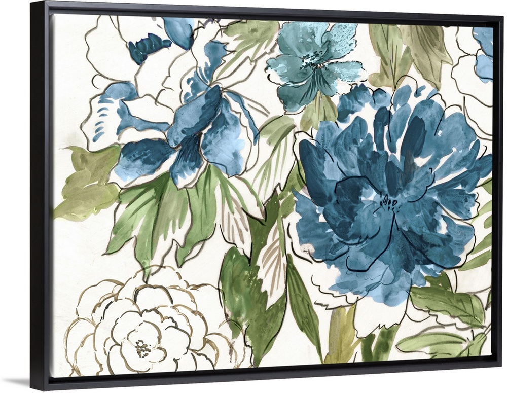 <p>A contemporary painting of flowers with featured colors of blue, green, and brown.</p>