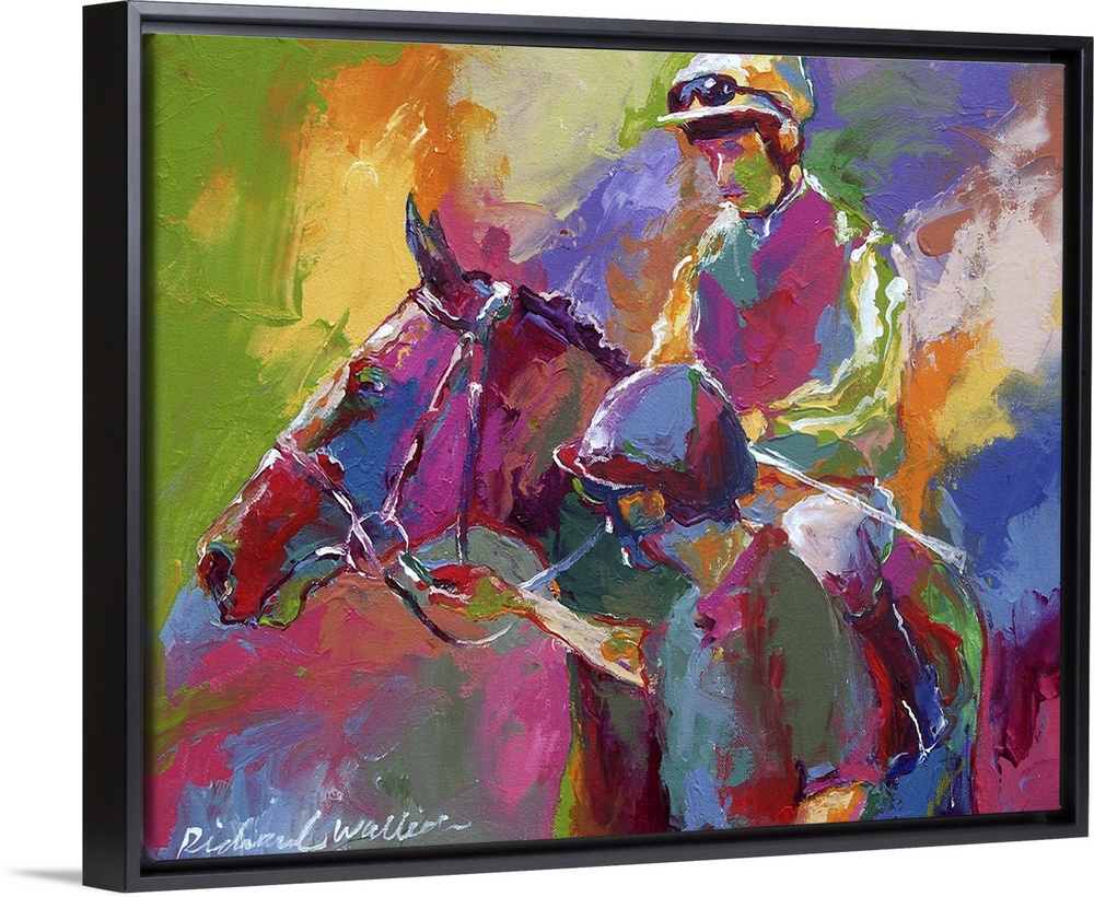 <p>Contemporary vibrant colorful painting of a jockey on horseback.</p>