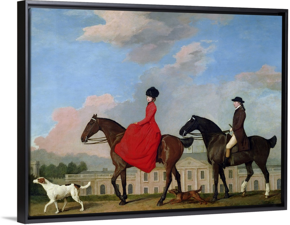<p>Classic artwork of a man and a woman riding their horses with their two dogs running along side them and a large house pictured in the background.</p>