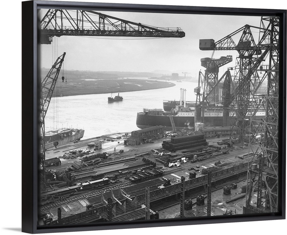 <p>A view of John Brown's Shipyards at Glasgow. Looking along the curving river Clyde, scene of many famous launchings.</p>