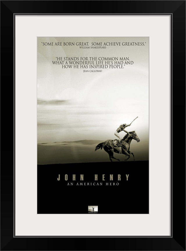 <p>Large movie poster for the movie titled "John Henry". It's in black and white and has a man riding his horse and standing up with an object in his hand so as to charge forward.</p>