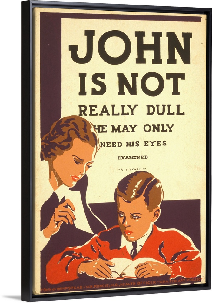 <p>Artwork recommending eye examinations for children having difficulty learning, showing a woman holding an eye chart in front of a boy reading a book.</p>
