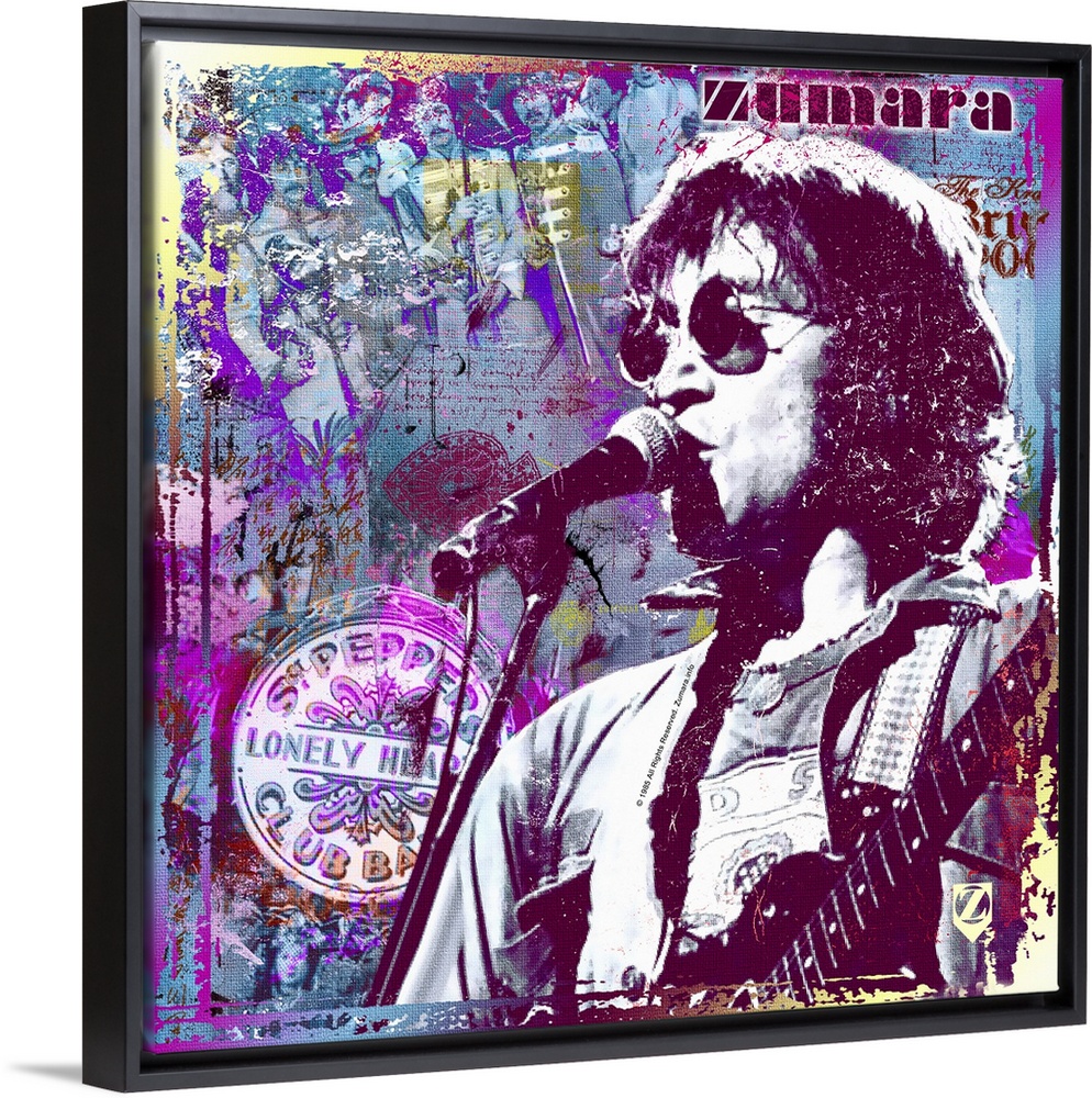 <p>Big square wall hanging of a bust image of Jon Lennon, holding a guitar as he sings into a microphone. The background is a roughly collaged collections of images including a photo of the Beatles, and a circular logo for Sgt. Peppers Lonely Hearts Club Band.</p>