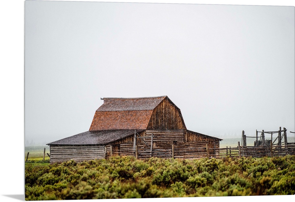 <p>View of the John Moulton Barn with fog rolling in, Grand Teton National Park, Wyoming.</p>