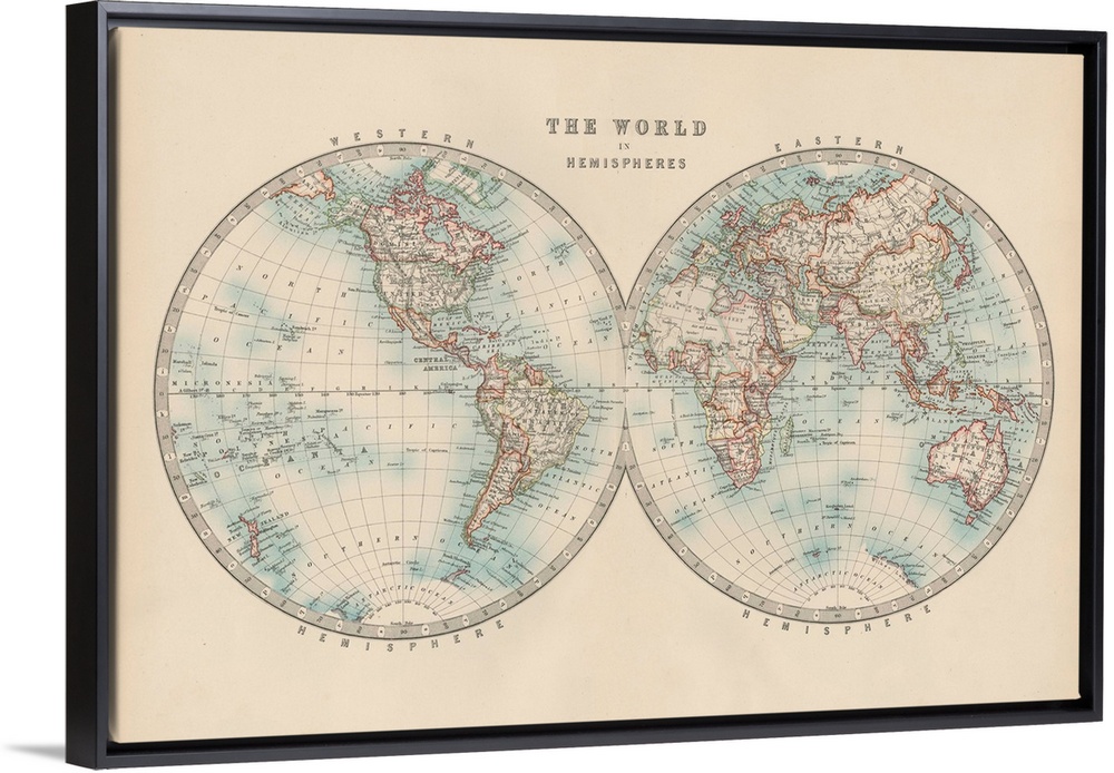 <p>Vintage map of the world divided in to eastern and western hemispheres.</p>