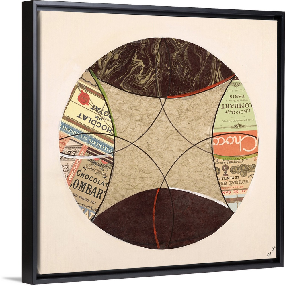 <p>Contemporary painting of a circle with different articles of print in the sections of the shape.</p>