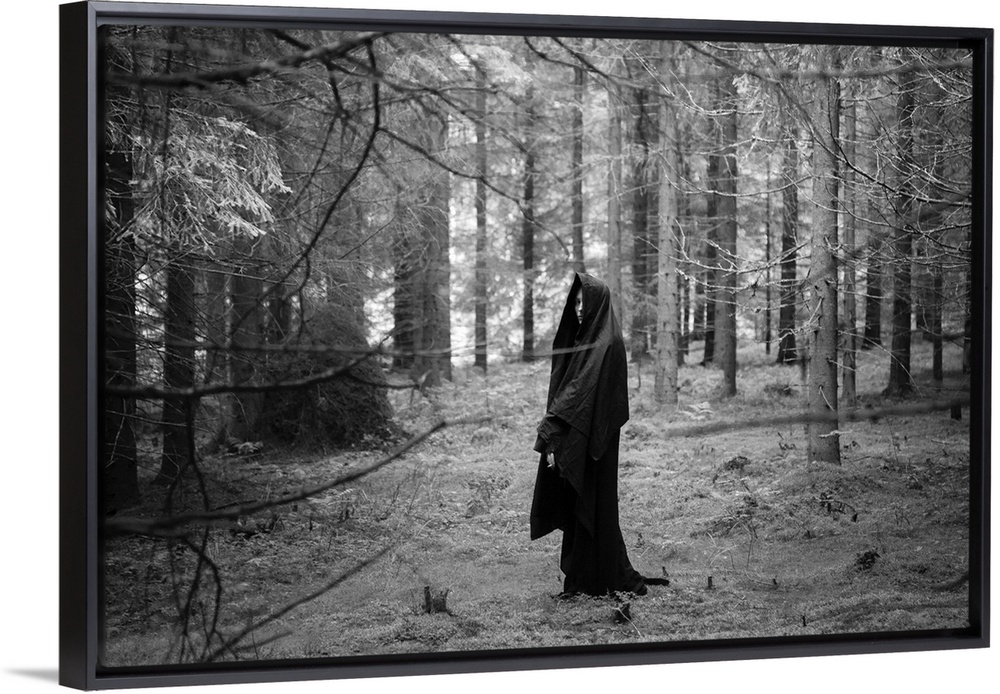 <p>Young adult female wearing veil standing alone in dark forest in winter</p>