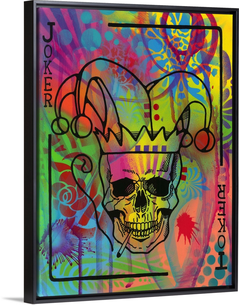 <p>Illustration of a Joker playing card with the skull smoking on a colorful graffiti style background.</p>