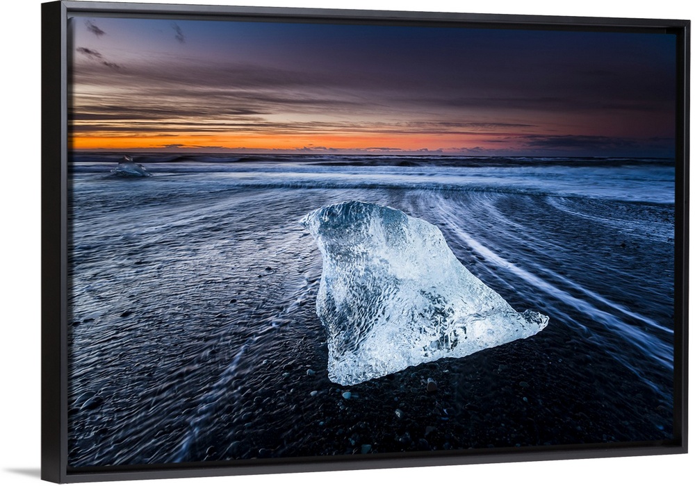 <p>An iceberg laying on the beach near Jokulsarlon, Iceland, captured during sunrise.</p>