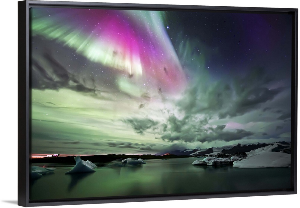 <p>Stunning northern lights display over the glaciers in Jokulsarlon Lake in Iceland.</p>