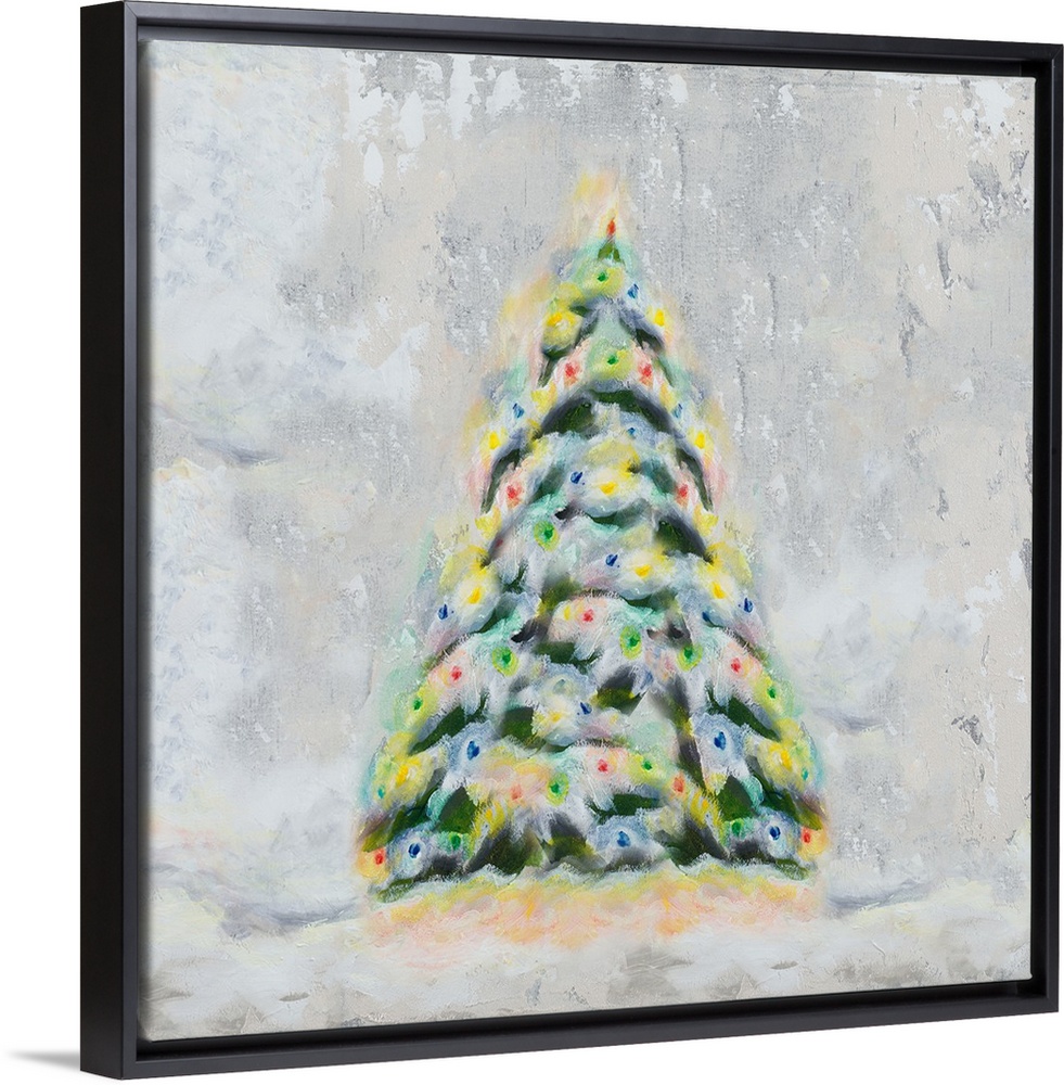 <p>A painting of a snowy and colorfully lit Christmas tree outside.</p>