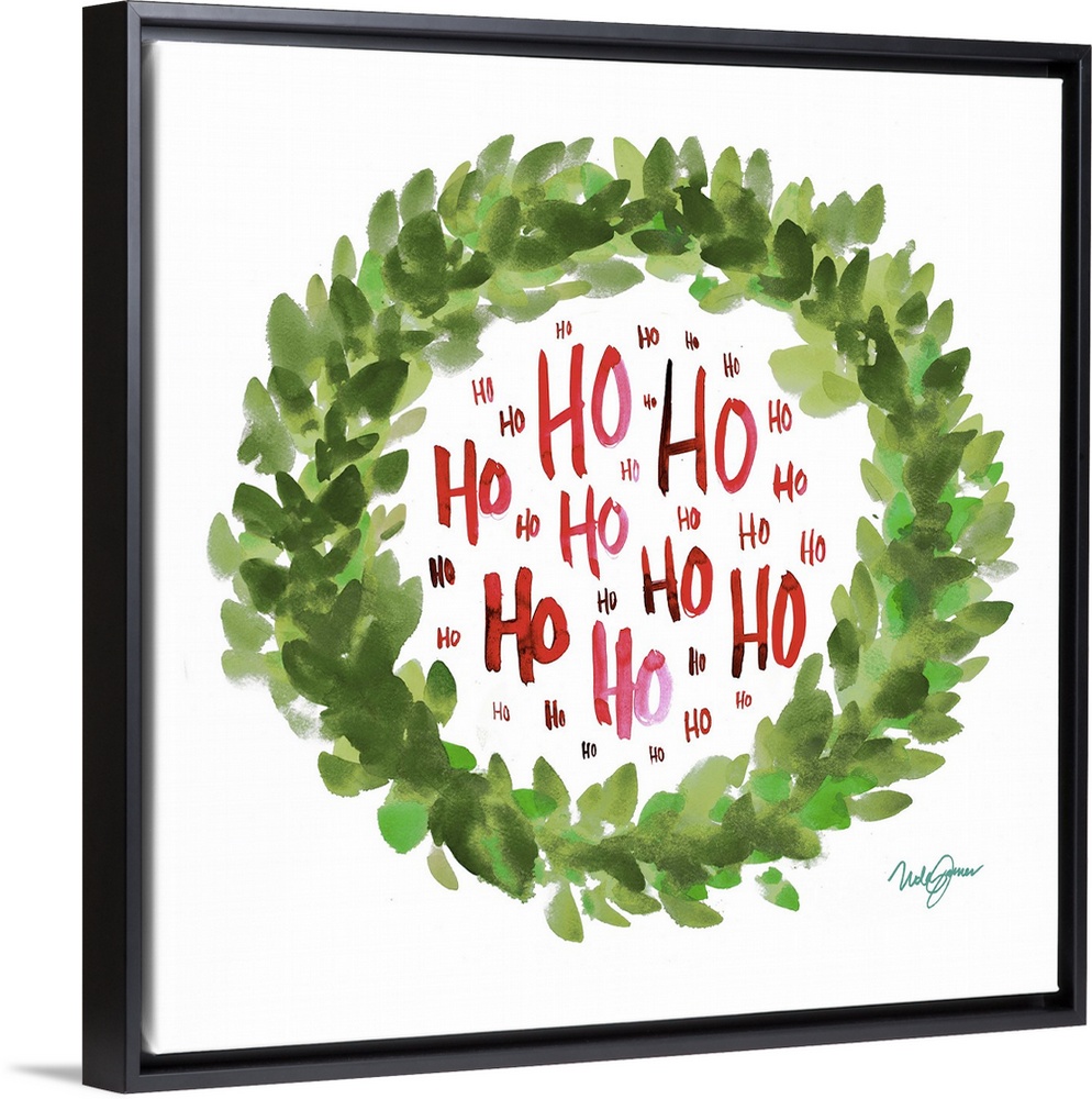 <p>Square watercolor painting of a green Christmas wreath with "Ho" written inside in red several times.</p>