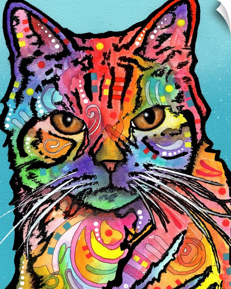 <p>Colorful illustration of a cat with graffiti-like markings on a blue background.</p>