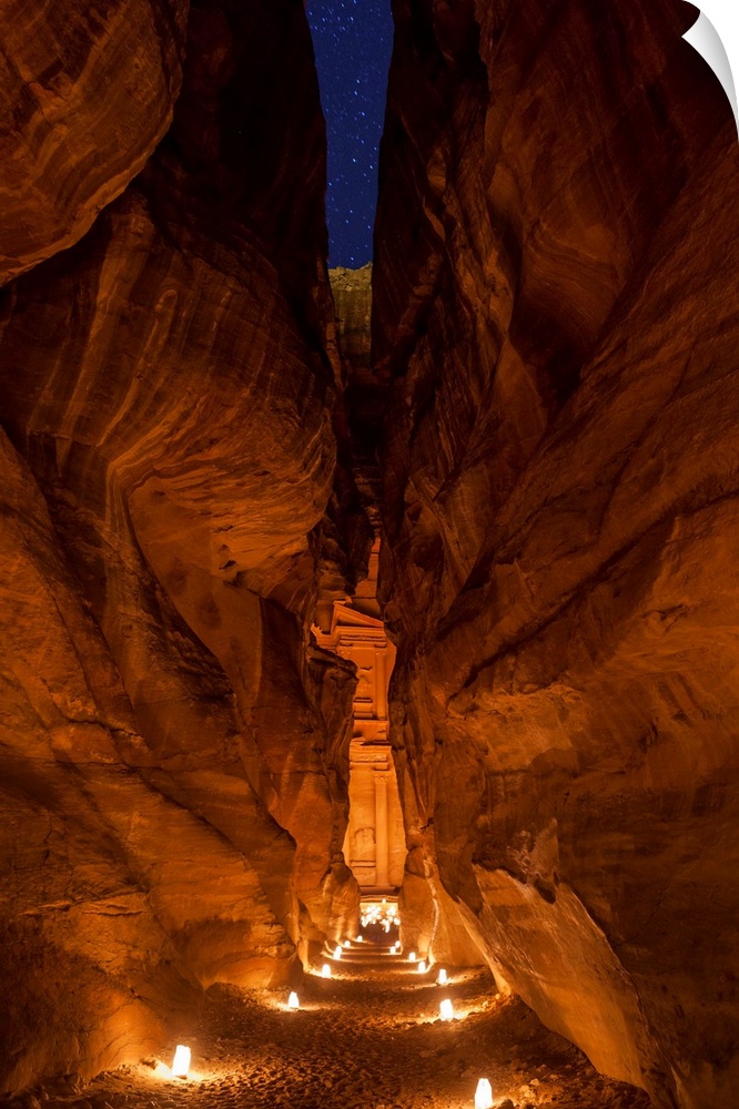 <p>Jordan, Maan, Petra, The Treasury, Siq entrance lit by candles.</p>