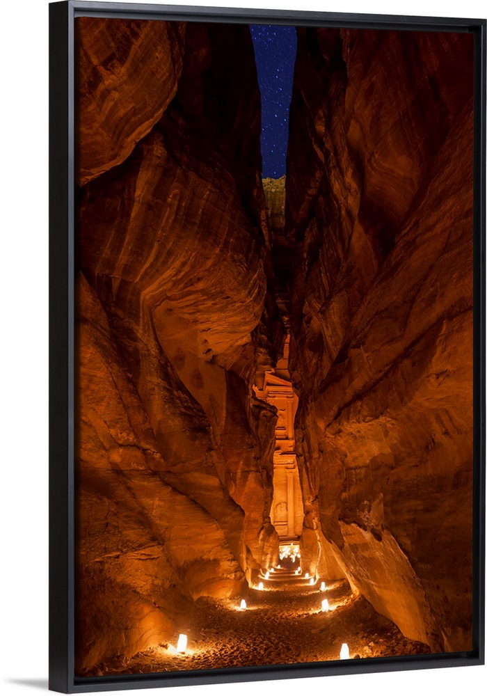 <p>Jordan, Maan, Petra, The Treasury, Siq entrance lit by candles.</p>