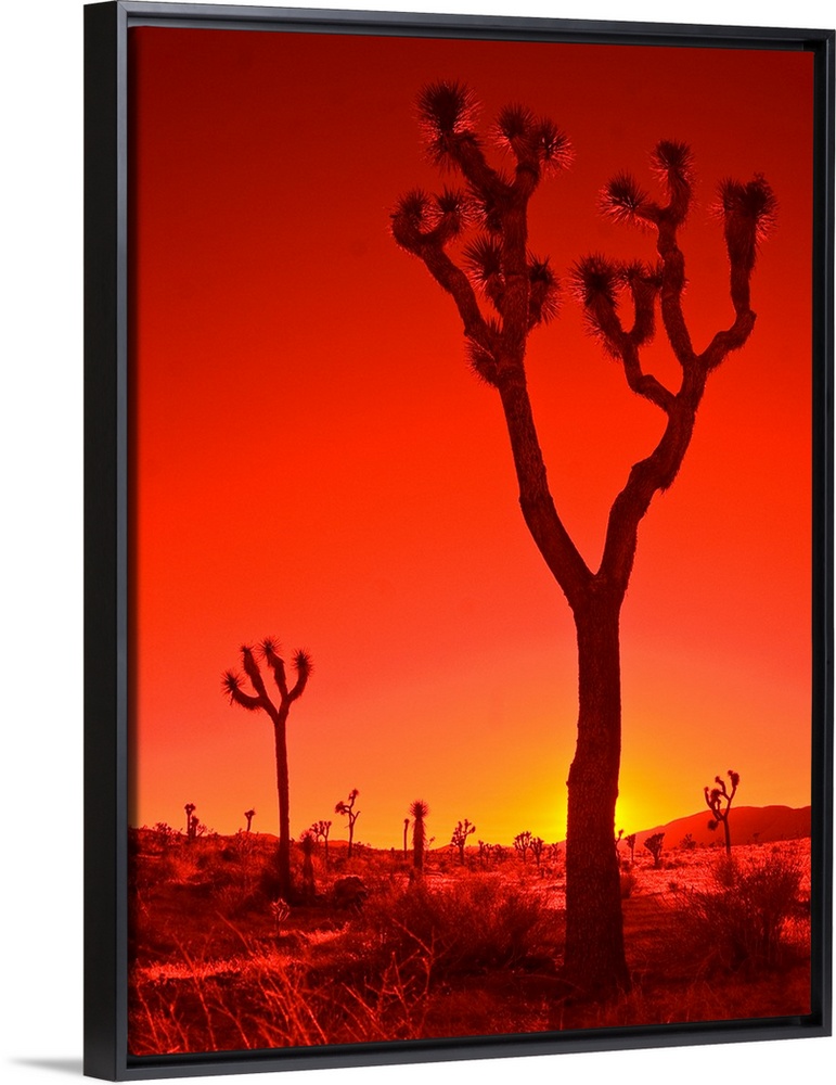 <p>Silhouetted Joshua Trees in Joshua Tree National Park at sunset, California.</p>