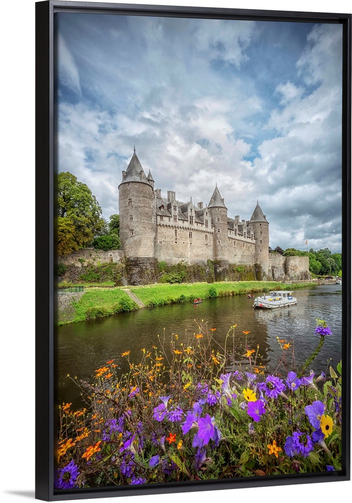 <p>View of a medieval castle from across the river with flowers.</p>