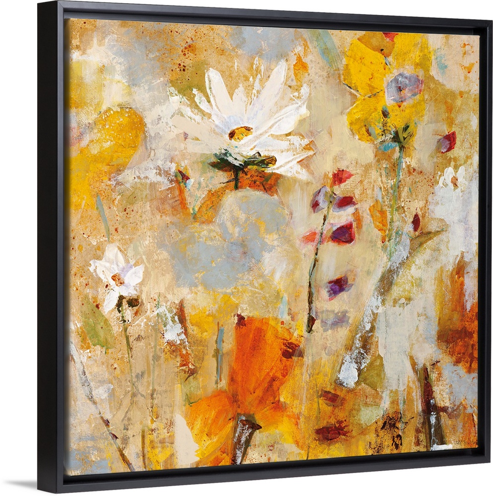 <p>Square painting of a group of colorful spring flowers with speckled drips of overlapping paint.</p>