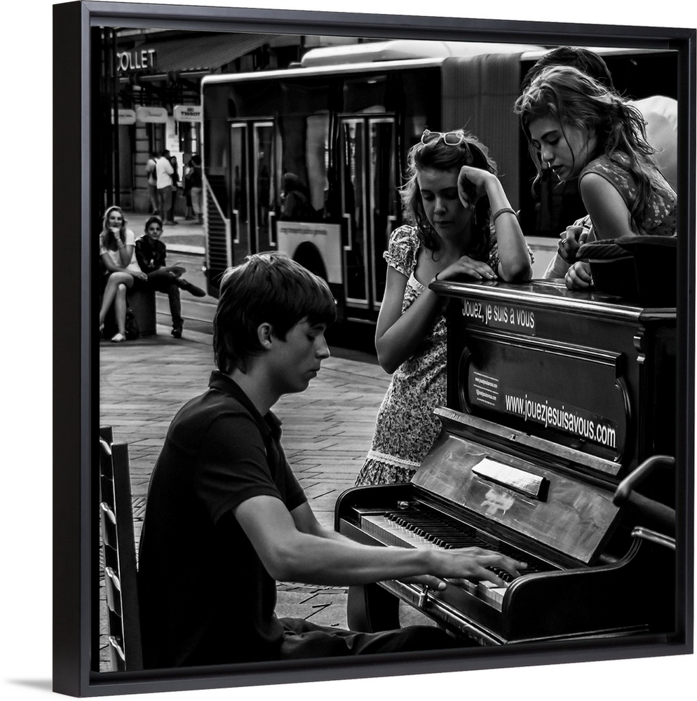 <p>A black and white photograph of a man playing a piano in the street and women sitting around listening.</p>