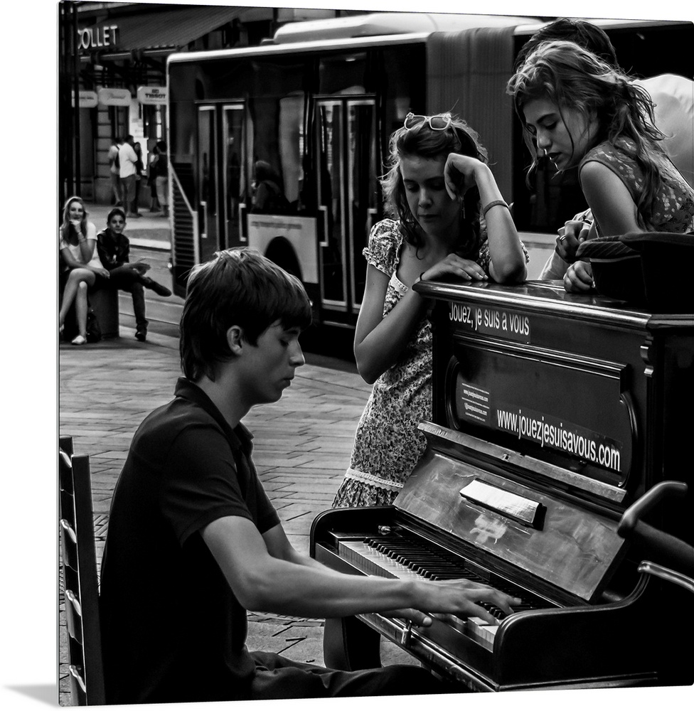 <p>A black and white photograph of a man playing a piano in the street and women sitting around listening.</p>