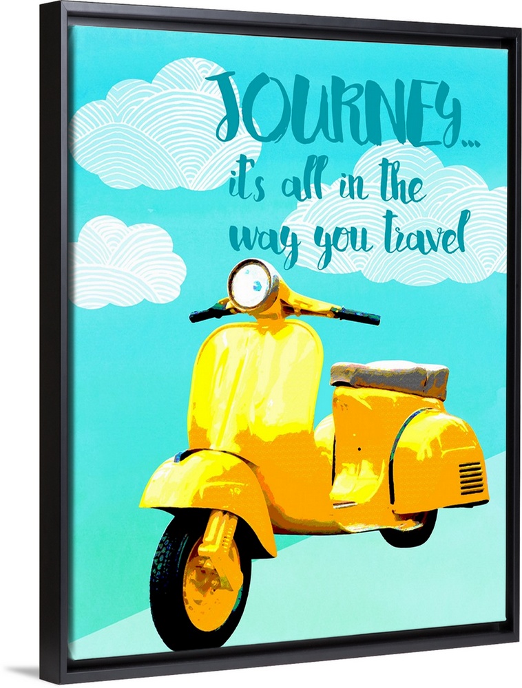 <p>"Journey... it's all in the way you travel" written on top of illustrated clouds with a bright yellow moped underneath.</p>