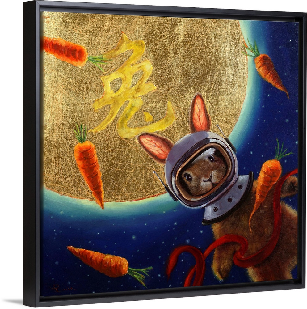 <p>A painting of a rabbit with an astronaut helmet floating in space with carrots.</p>