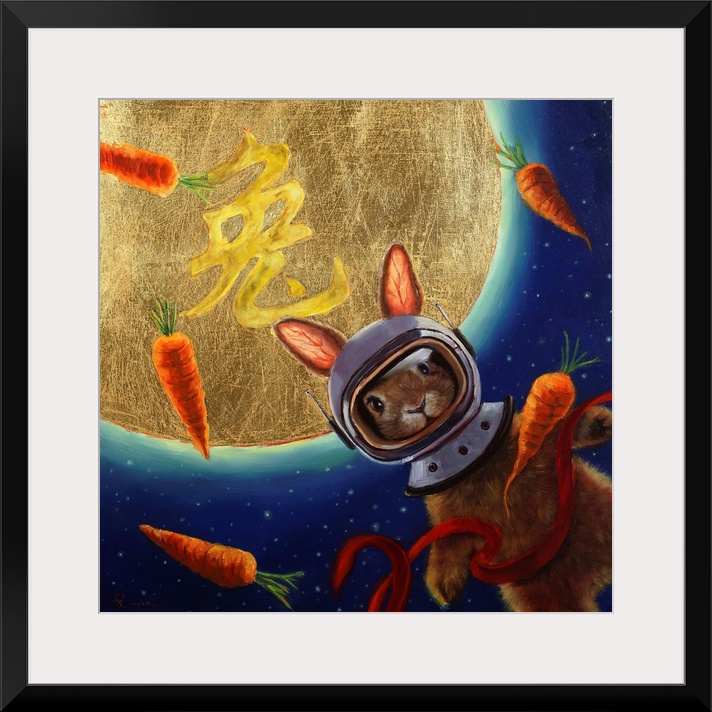 <p>A painting of a rabbit with an astronaut helmet floating in space with carrots.</p>