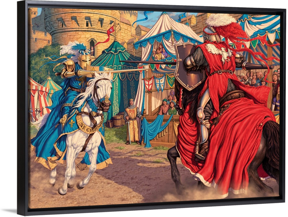 <p>A scene depicting a jousting tournament just at the moment the King's champion attempts to vanquish the all conquering mysterious knight.</p>