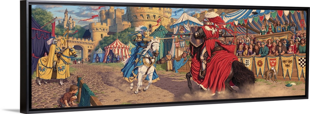 <p>A scene depicting a jousting tournament just at the moment the King's champion attempts to vanquish the all conquering mysterious knight.</p>