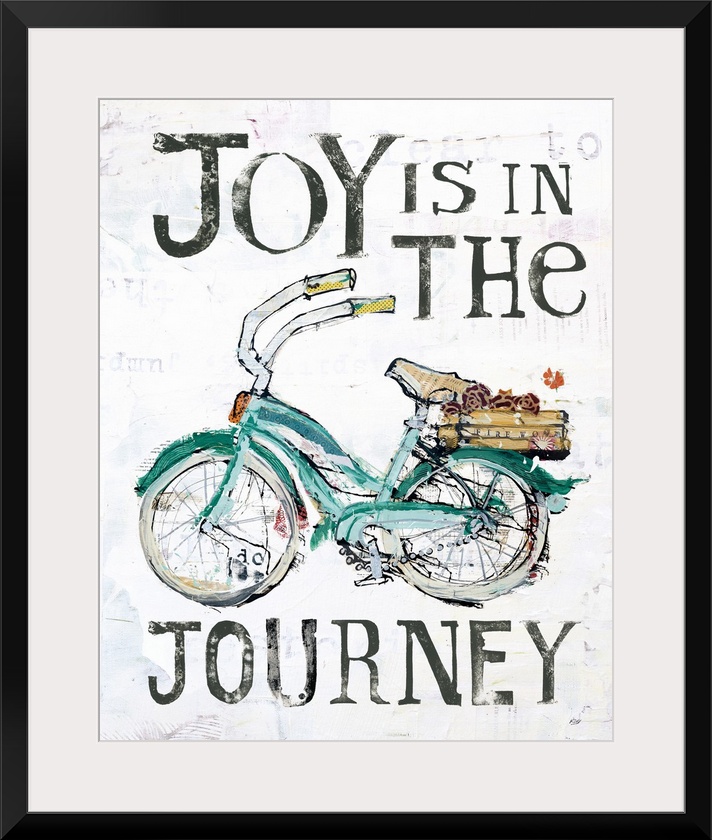 <p>"Joy is in the Journey" with a green bicycle, created with mixed media</p>