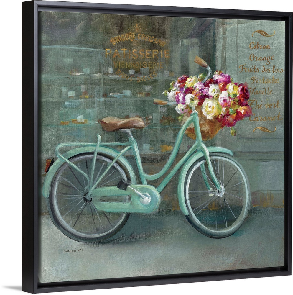 <p>Contemporary artwork of a bicycle with flowers in the handlebar basket.</p>