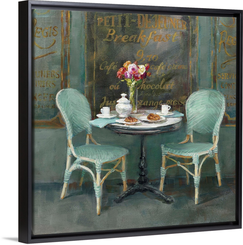 <p>Contemporary artwork of two chairs and a table at an outdoor cafe.</p>