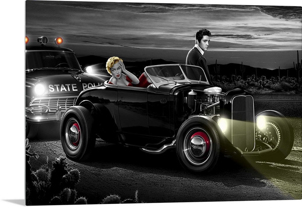 <p>Digital art painting of Marilyn and Elvis in a roadster being pulled over by the State Police by Helen Flint.</p>