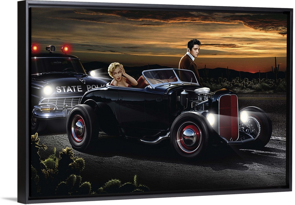 <p>Digital art painting of Marilyn and Elvis in a roadster being pulled over by the State Police by Helen Flint.</p>