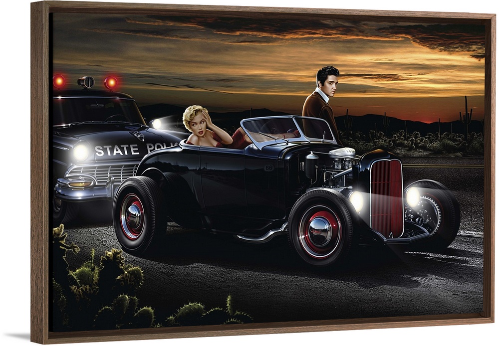 <p>Digital art painting of Marilyn and Elvis in a roadster being pulled over by the State Police by Helen Flint.</p>