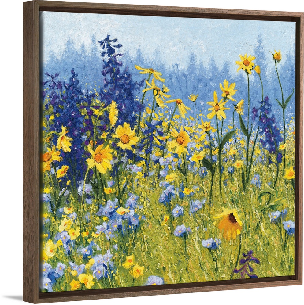 <p>Contemporary painting of a field of wildflowers with blue, green, purple, and yellow hues.</p>