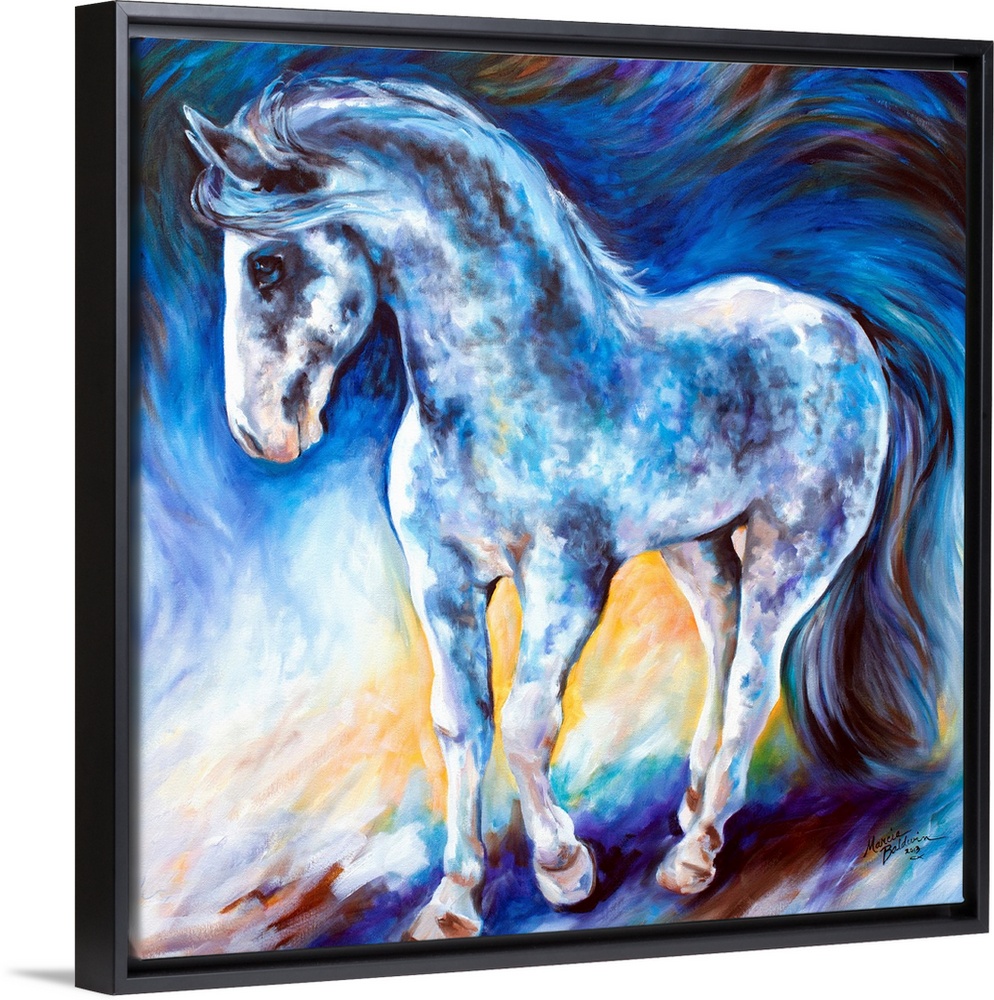<p>Contemporary painting of a horse made with black, white, and blue hues on an abstract square background.</p>