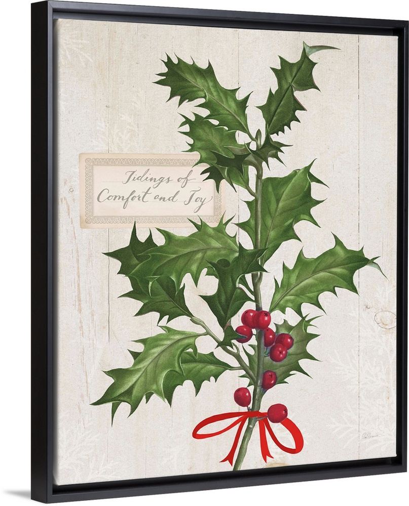 <p>Decorative artwork of holly with the words "Tidings of Comfort and Joy" on a white wood background.</p>