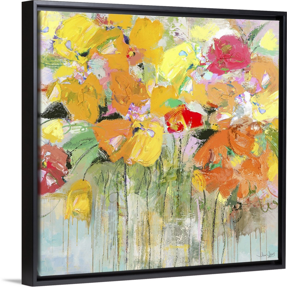 <p>Contemporary artwork of several orange, yellow, and red flowers in a garden.</p>