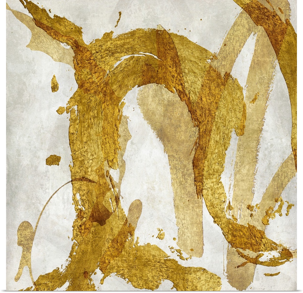 <p>Square abstract art with metallic gold brushstrokes going in all directions on a white background.</p>