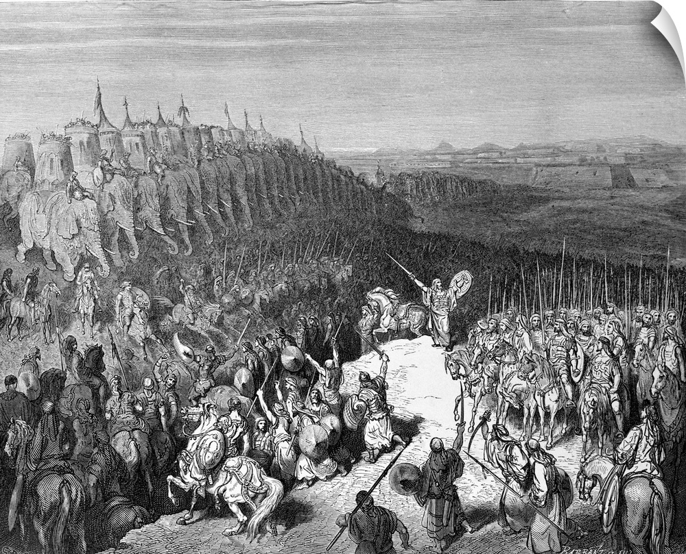 <p>Judas Maccabeus encouraging the Israelites in front of the army of Nikanor. Woodcut by Gustave Dore.</p>