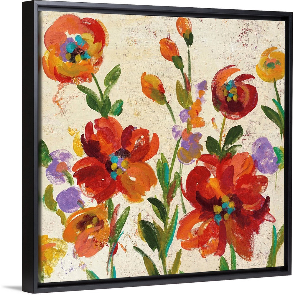 <p>Square contemporary painting of colorful red and orange flowers on a beige and cream colored background.</p>