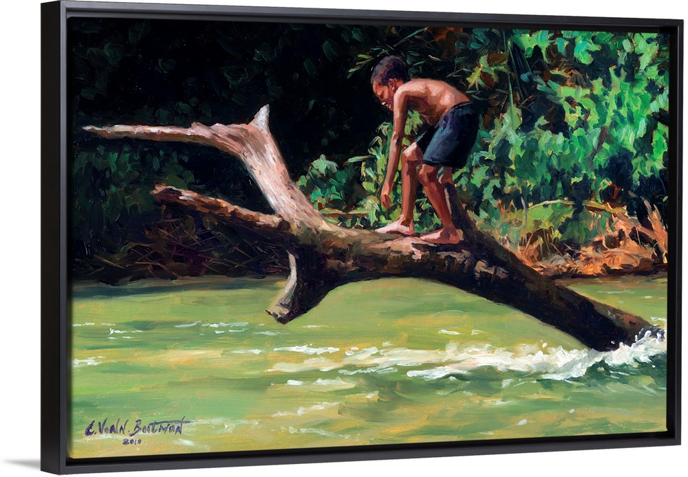<p>Contemporary painting of a boy on a tree ready to jump into the water.</p>
