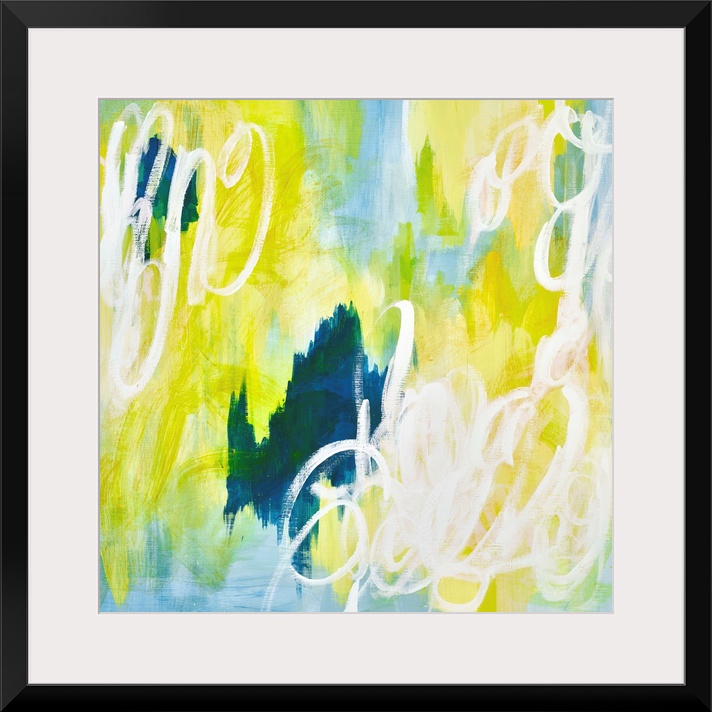 <p>Contemporary abstract retro stylized painting of white squiggles against a blue and neon yellow background.</p>
