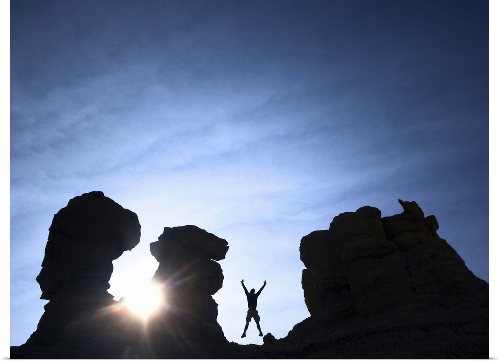 <p>man with arms raised and jumping with sunshine surrounded by silhouetted sandstone rock formation pinnacles. mesa de cuba, northern new mexico, usa.</p>