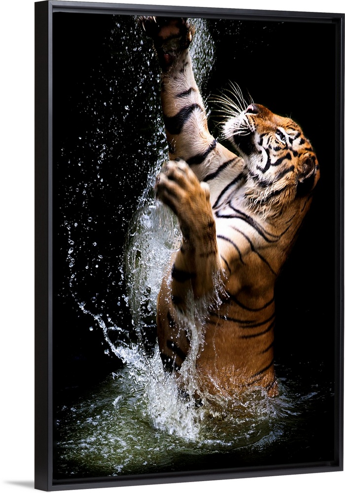 <p>A tiger leaping out of the water, reaching up with its paws.</p>