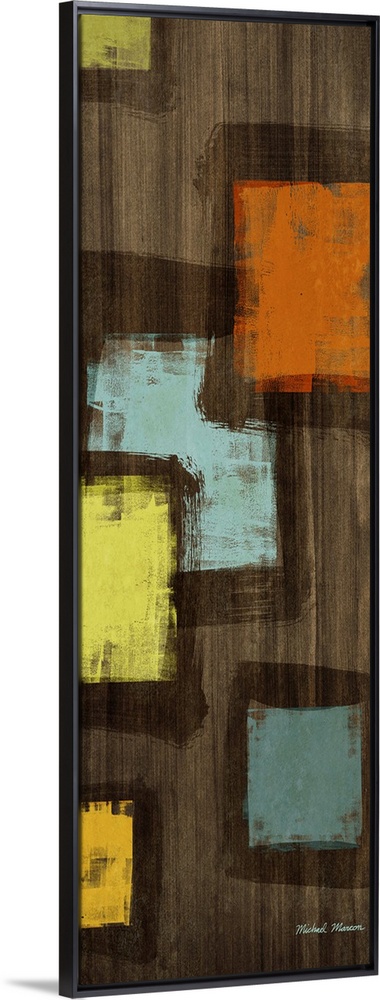 <p>Tall and narrow abstract painting on canvas of vibrant squares on top of a wooden type background.</p>